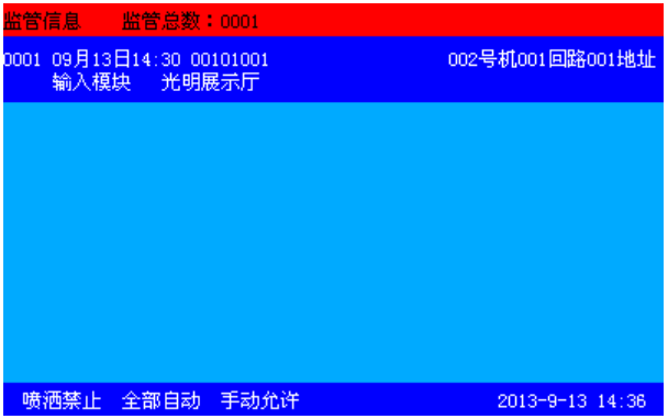 本控制器可在總線上連接輸入模塊,可通過總線部件設置成監管模式。當發生監管報警后控制器將進入監管報警信息顯示(如圖3-5所示),同時監管指示燈常亮。