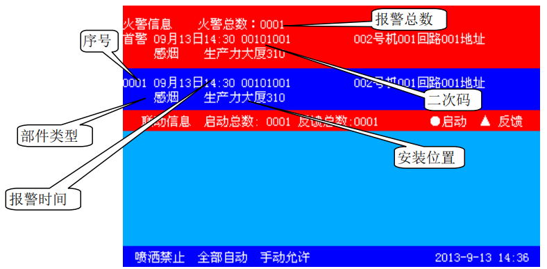 控制器經確認后進入火災報警狀態并發出火警聲、光警報。此時面板上紅色火警指示燈常亮,液晶屏上顯示火警序號、火警總數、首警部位、報警部件的編碼及類型、報警時間、安裝位置等信息(詳見圖上半屏顯示),同時打印機、歷史記錄記錄相關火警信息。當火警數量超過兩條顯示時,除首警外,其余報警可自動循環顯示,按鍵盤上的“▲”、“▼”鍵也可手動查詢。